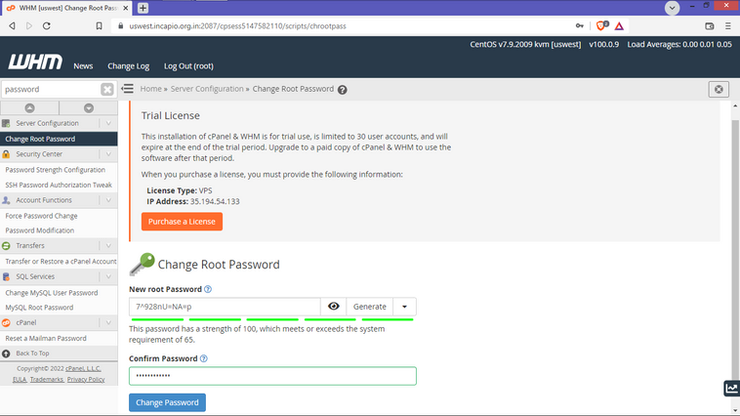 Administrator cPanel license tutorial May 6, 2022 Prerequisites: You will need the following items to complete this tutorial There are a few ways to reset the WHM password. This article will cover the most valuable practices used to reset the WHM password. Method – 1: How to reset WHM password through SSH (Secure Shell). This method will cover the most appropriate practice to reset WHM root password through CLI (command-line interface). Please remember that no separate password is used for logging into the WHM. Instead, WebHost Manager uses the operating system root password. So, we have to reset the root password. Log in to SSH. Type “sudo su –” to switch to the root user in the terminal interface. Output: [manoj@uswest ~]$ sudo su - Last login: Wed Feb 9 20:53:49 IST 2022 on pts/0 [root@uswest ~]# Lastly, type “passwd root” in the terminal. Output: [root@uswest ~]# passwd root Changing password for user root. New password: Retype new password: passwd: all authentication tokens updated successfully. [root@uswest ~]# Finally, type your root password and confirm the password. Note: If you’re running the cPanel & WHM server in the Cloud infrastructure, make sure to generate SSH key pair and upload your SSH public key into the VM instance to connect the VM instance through SSH. For Google Cloud Platform, follow the below article and learn how to connect Google’s compute engine VM instance through SSH. Method – 2: How to reset WHM password through the WebHost Manger Interface. WHM Change Password Interface Lastly, type your root password and confirm the password. Finally, Click on the “Change Password” button to update the WHM password. Conclusion: Here are some recommended cPanel & WHM tips and tricks. You can also use the “Terminal” option in the WHM interface to reset the WHM password. To learn more about the Terminal option, visit the link. - 0 Share on Facebook Share on twitter